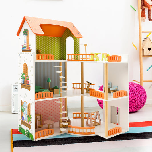 3 Story Wooden Doll House With Balcony 23 Accessories Toy Gift For 3 +Years Kids