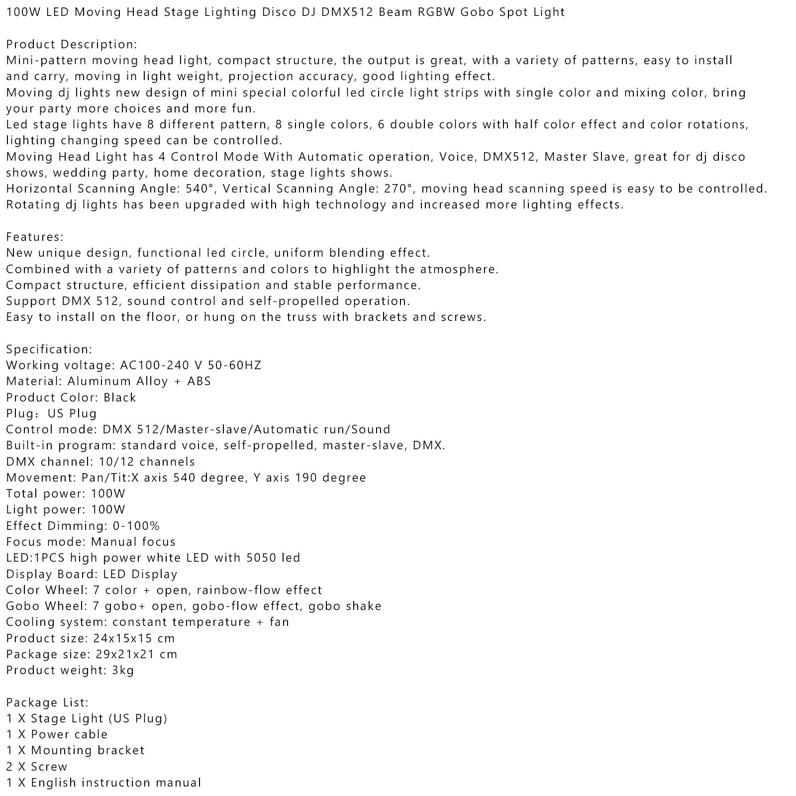 100W LED Moving Head Stage Light – RGBW Beam Spot Gobo DMX512 DJ Disco Party Lighting