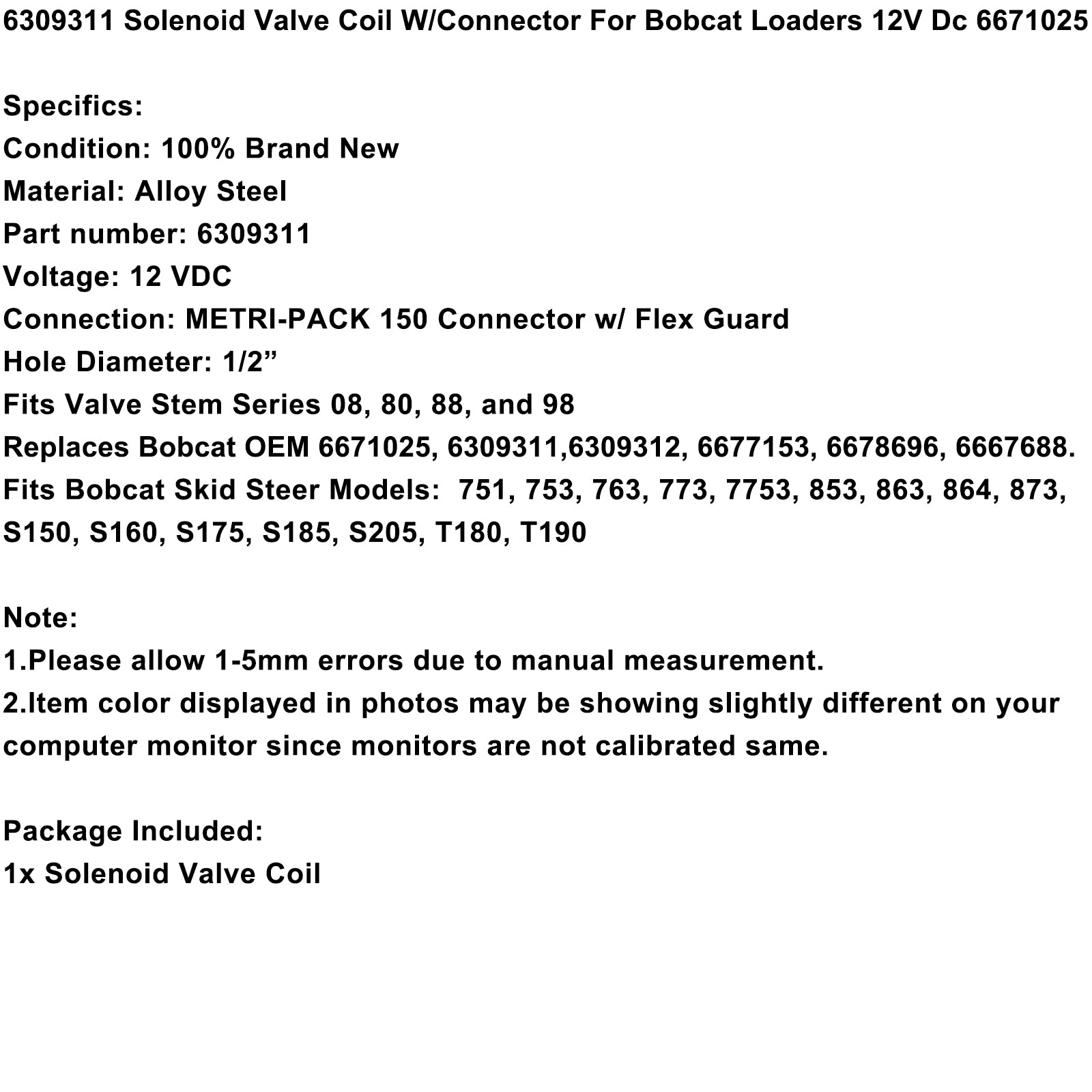 6309311 Solenoid Valve Coil W/Connector For Bobcat Loaders 12V Dc 6671025 Generic