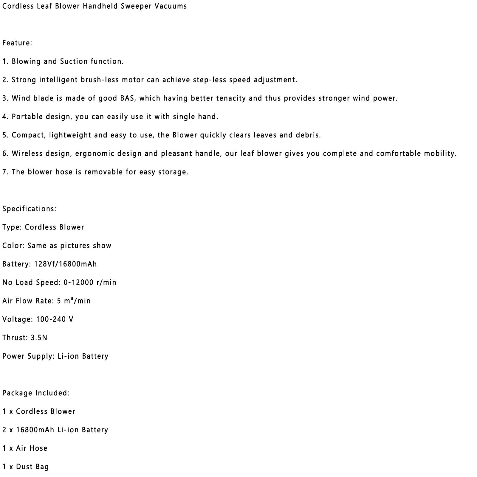 π¦ Package Includes: 1x Cordless Blower, 2x 16800mAh Batteries, 1x Hose, 1x Dust Bag, 1x Adapter, 1x Manual β Ready to Clean!