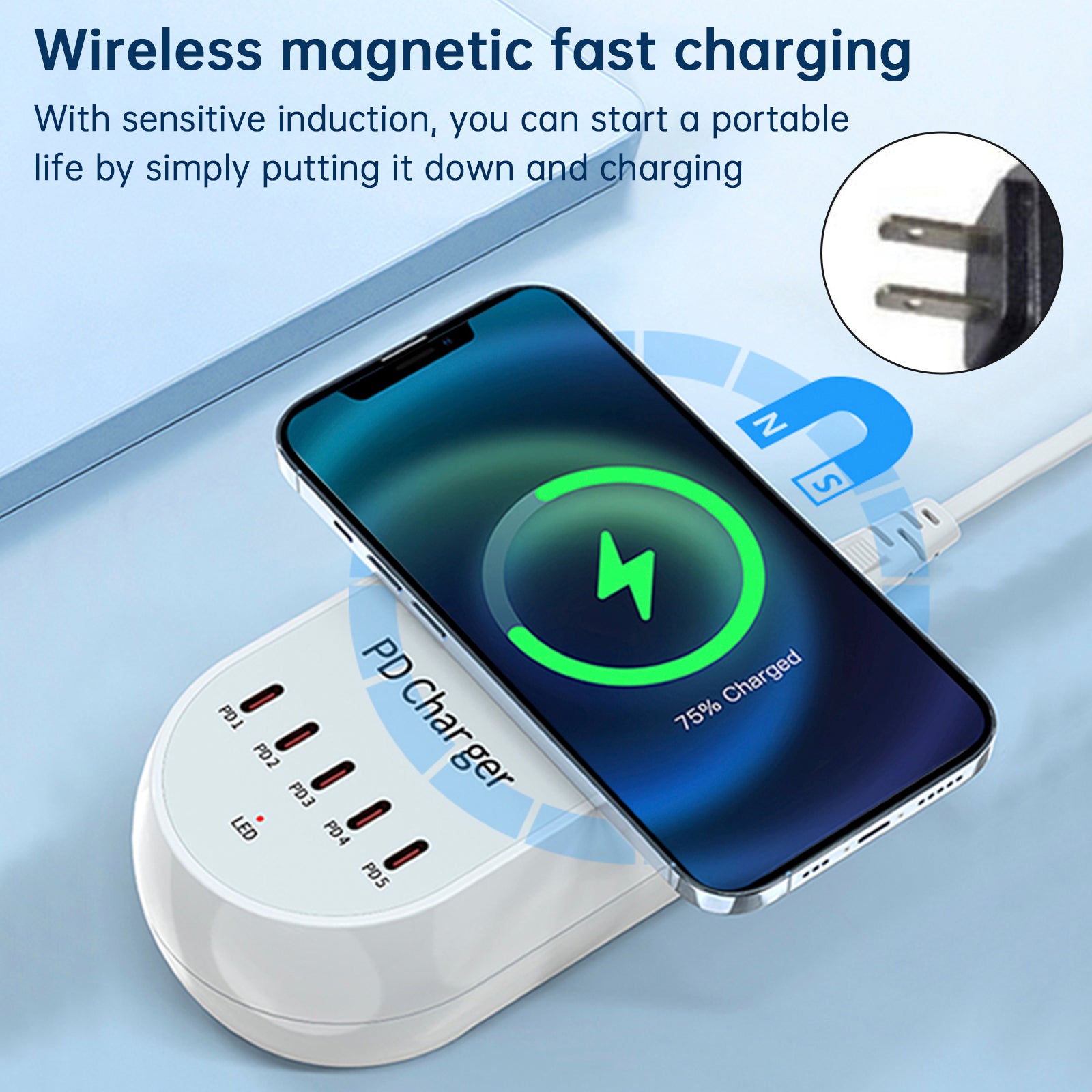 5. Wireless magnetic fast charging, freeing your hands. Sensitive induction, you can charge it by putting it down, and portable life starts from now on