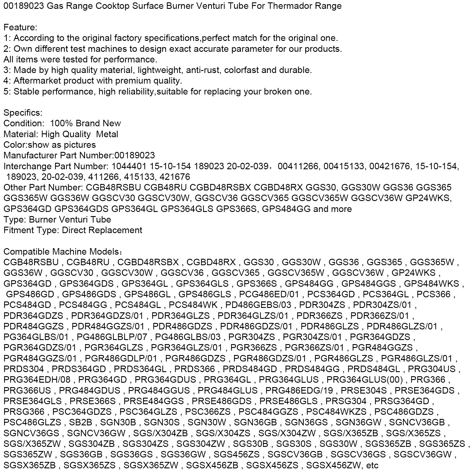 00189023 Gas Range Cooktop Surface Burner Venturi Tube For Thermador Range