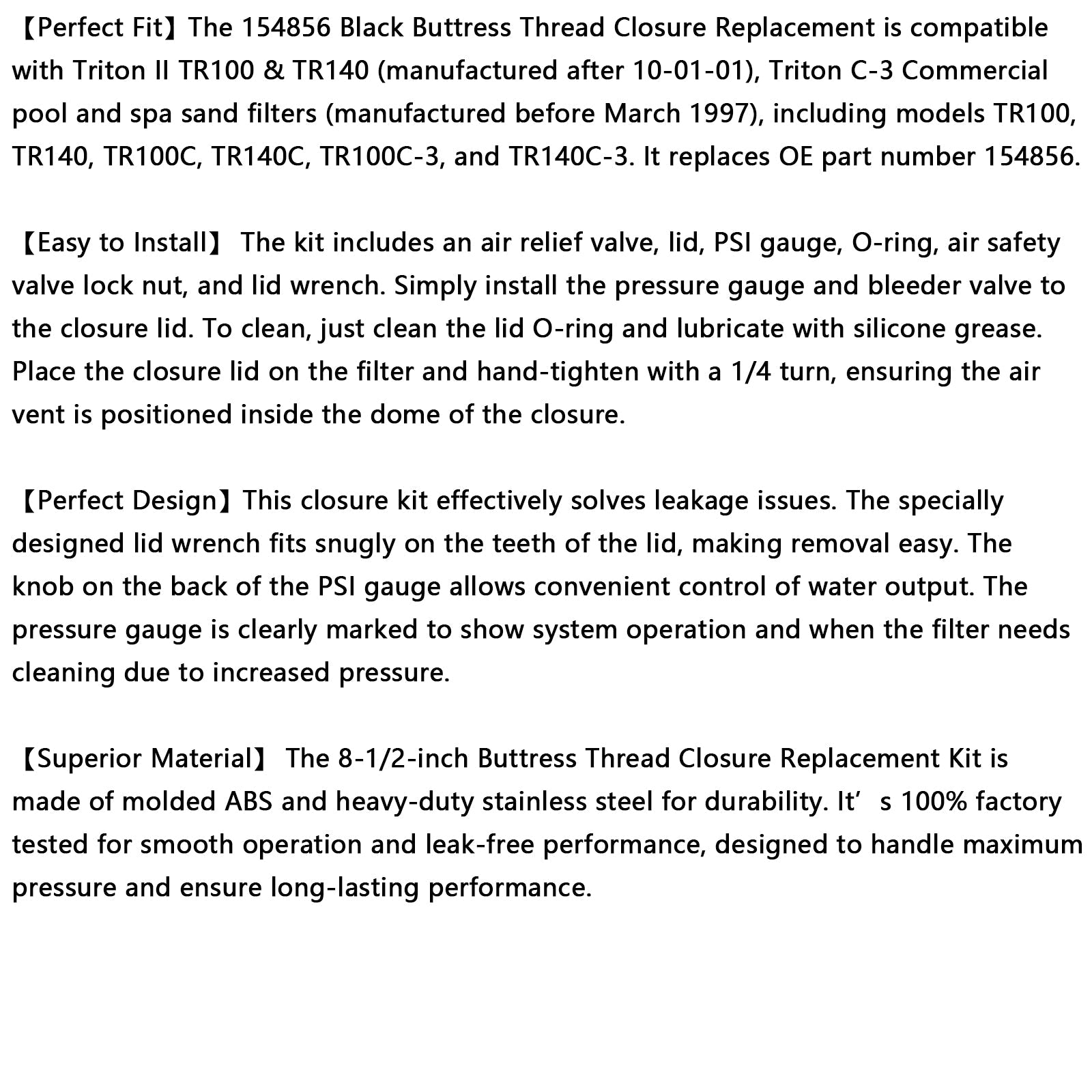 [Perfect Fit]The 154856 Black Buttress Thread Closure Replacement is compatible with Triton II TR100 & TR140 (manufactured after 10-01-01), Triton C-3 Commercial pool and spa sand filters (manufactured before March 1997), including models TR100, TR140, TR100C, TR140C, TR100C-3, and TR140C-3. It replaces OE part number 154856.