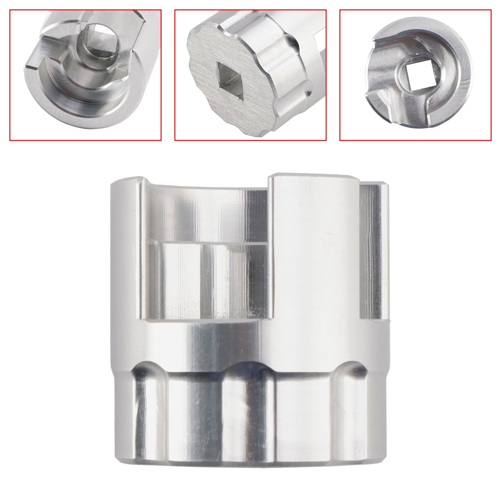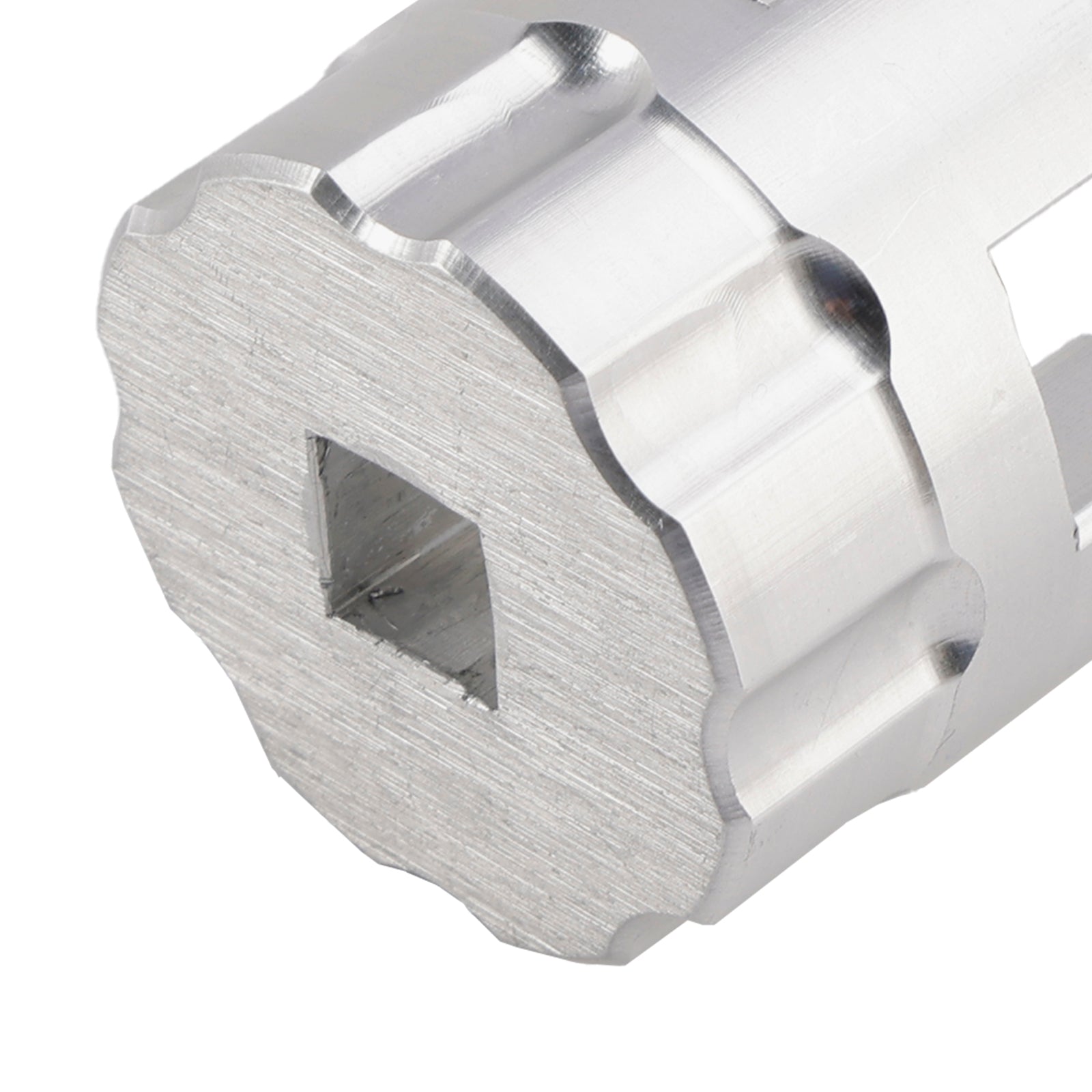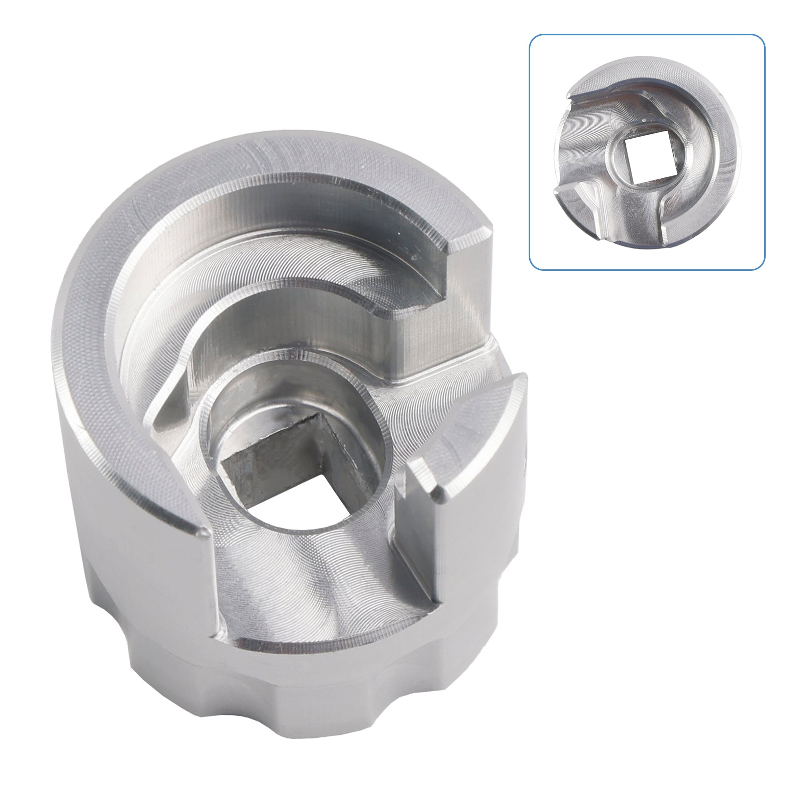 This is CNC machined for a precision fit out of 6061 aluminum. It has a 3/8" square drive hole. The socket is a raw machined finish.
