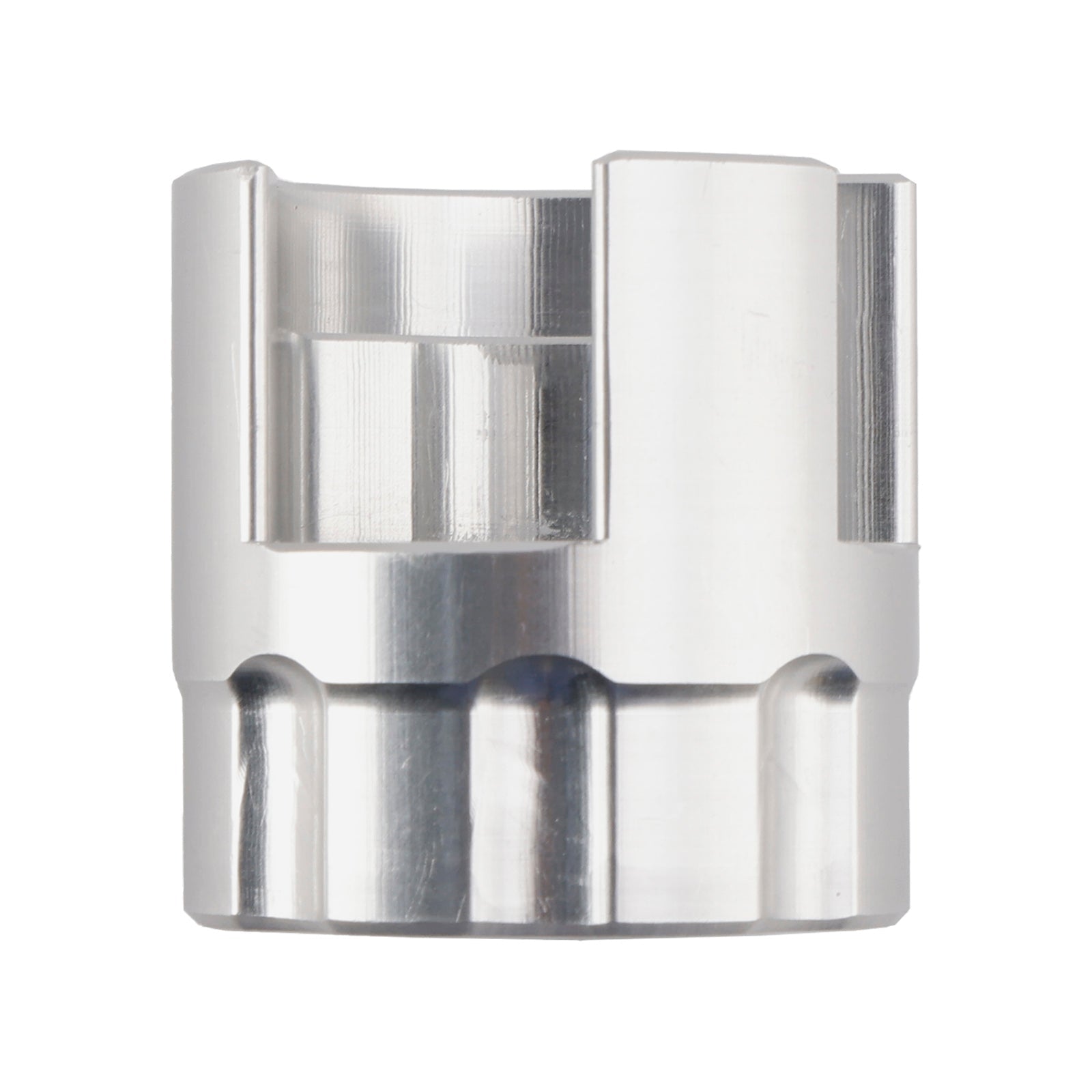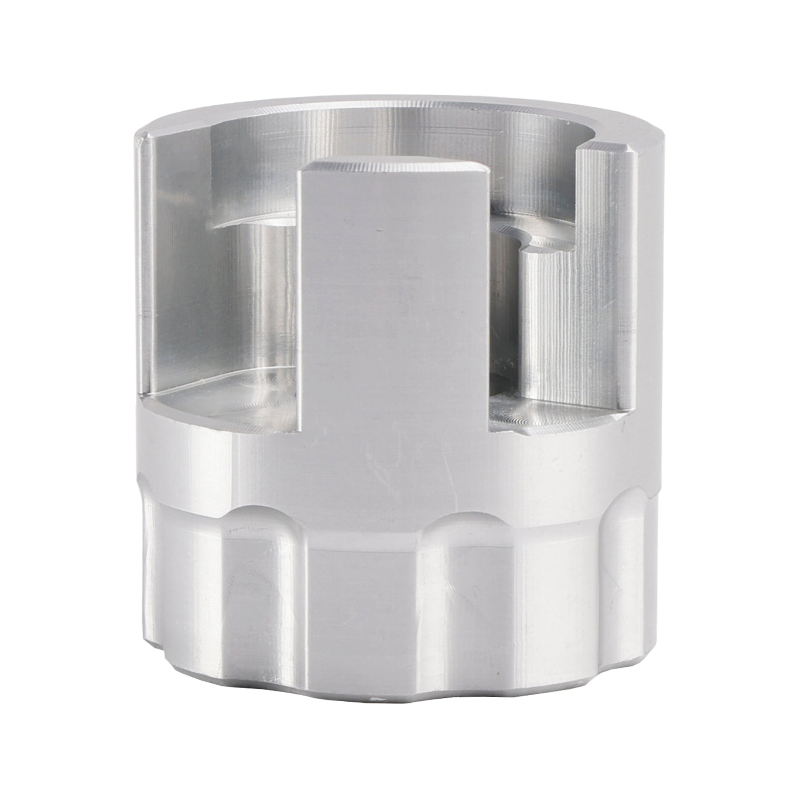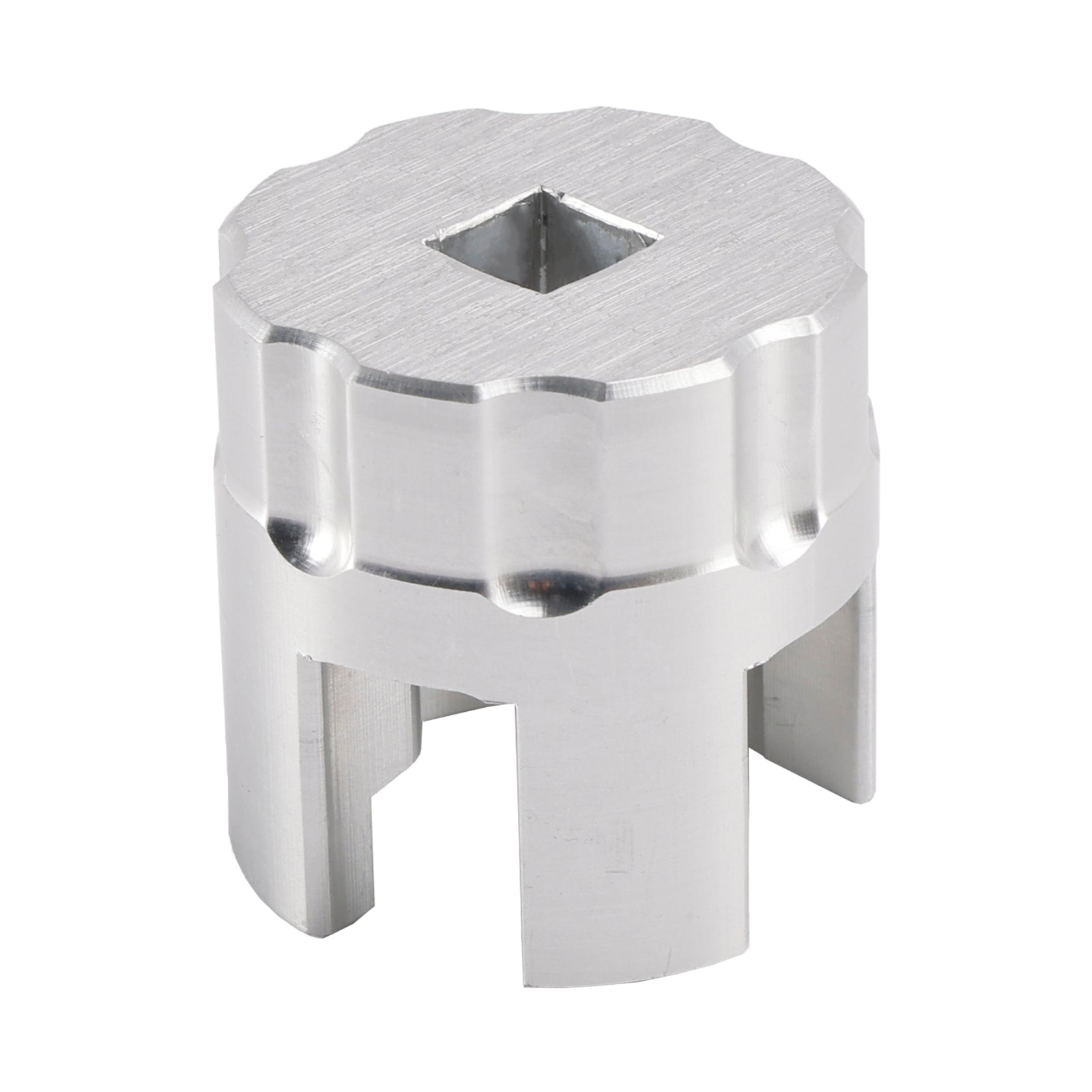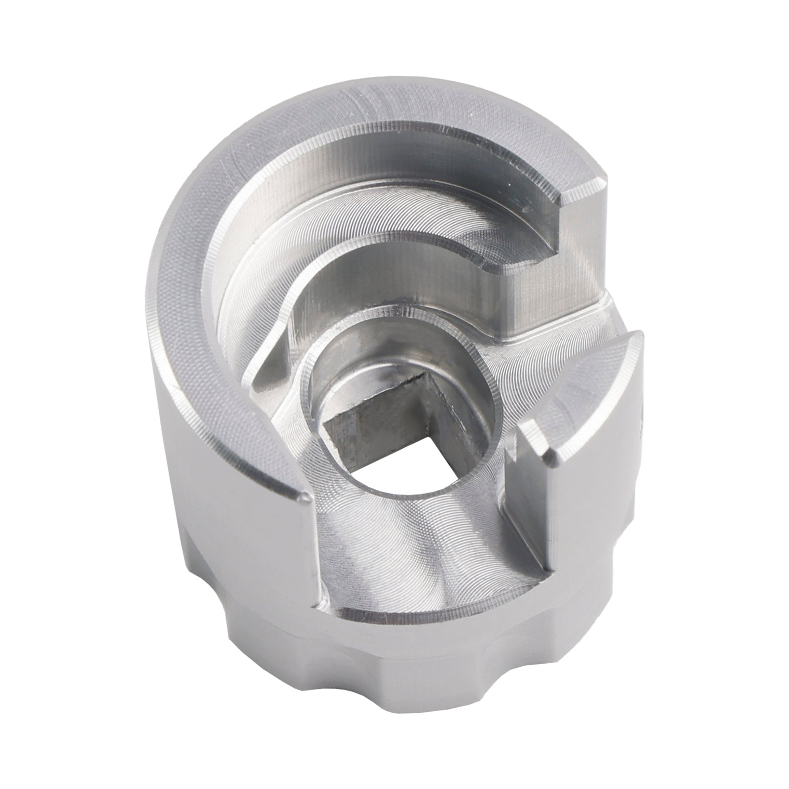 This is CNC machined for a precision fit out of 6061 aluminum. It has a 3/8" square drive hole. The socket is a raw machined finish.