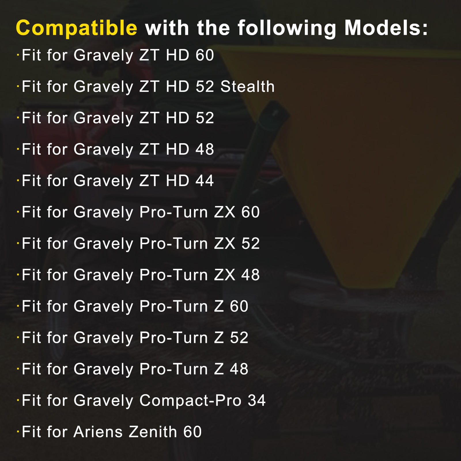 Specifically designed for Gravely ZT HD 44 48 52 60, COMPACT-PRO 34, PRO-TURN Z 48 52 60, PRO-TURN ZX 48 52 60, and Ariens ZENITH 60 models. This hitch ensures a precise fit and reliable performance for your zero-turn mower.