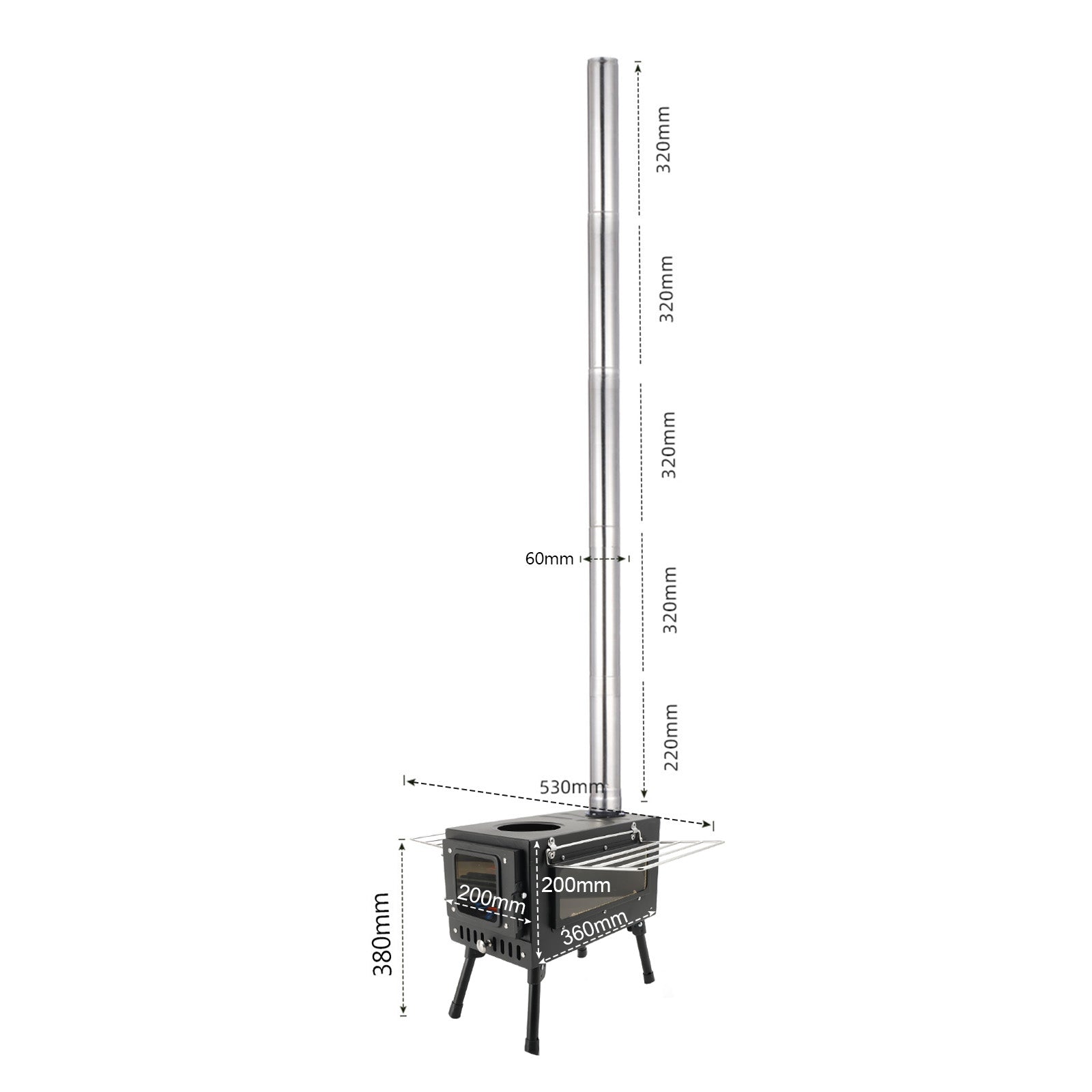 The five-piece chimney pipe (four 32cm sections, one 22cm) ensures adjustable height and efficient ventilation, keeping smoke at bay.