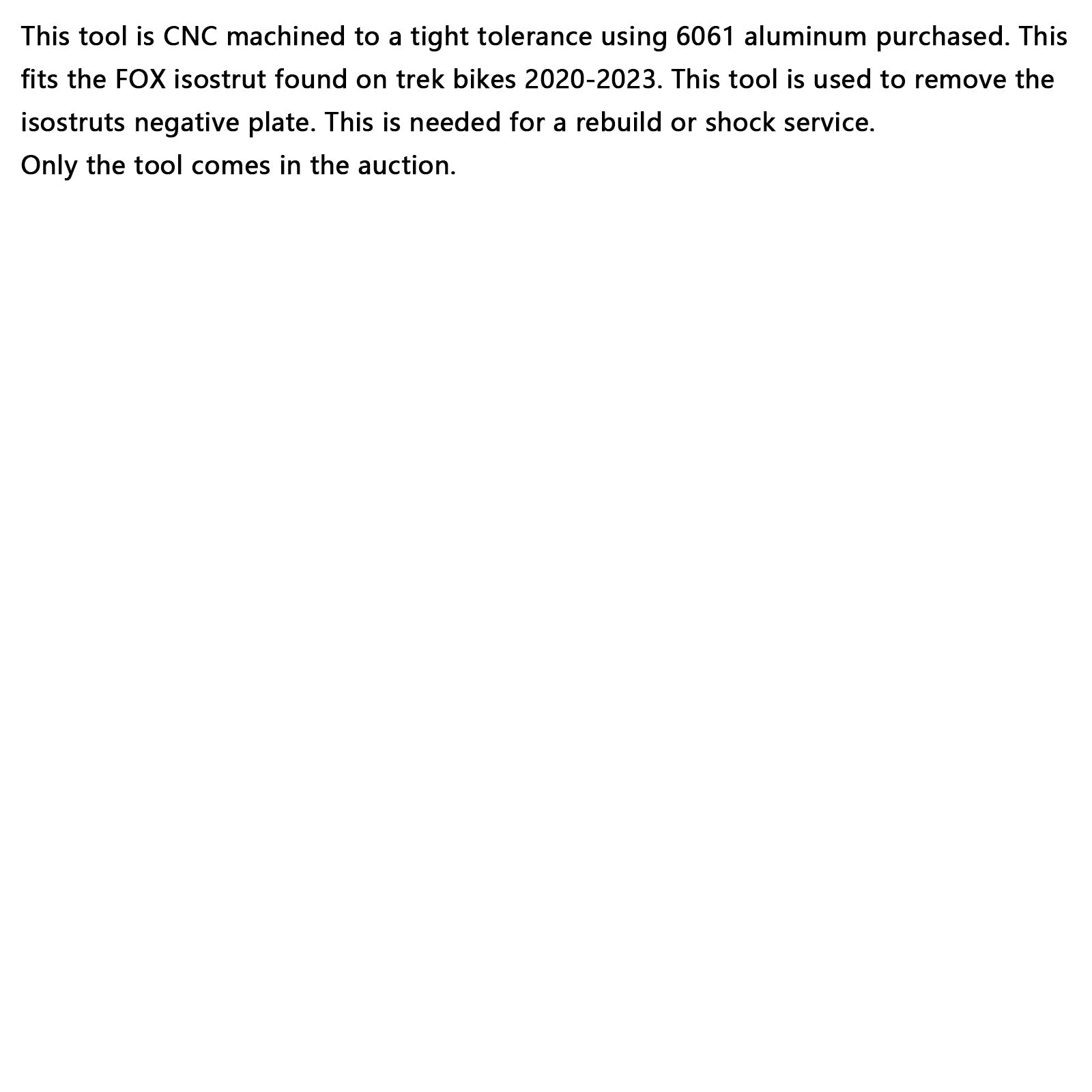 This tool is CNC machined to a tight tolerance using 6061 aluminum purchased. This fits the FOX isostrut found on trek bikes 2020-2023. This tool is used to remove the isostruts negative plate. This is needed for a rebuild or shock service.