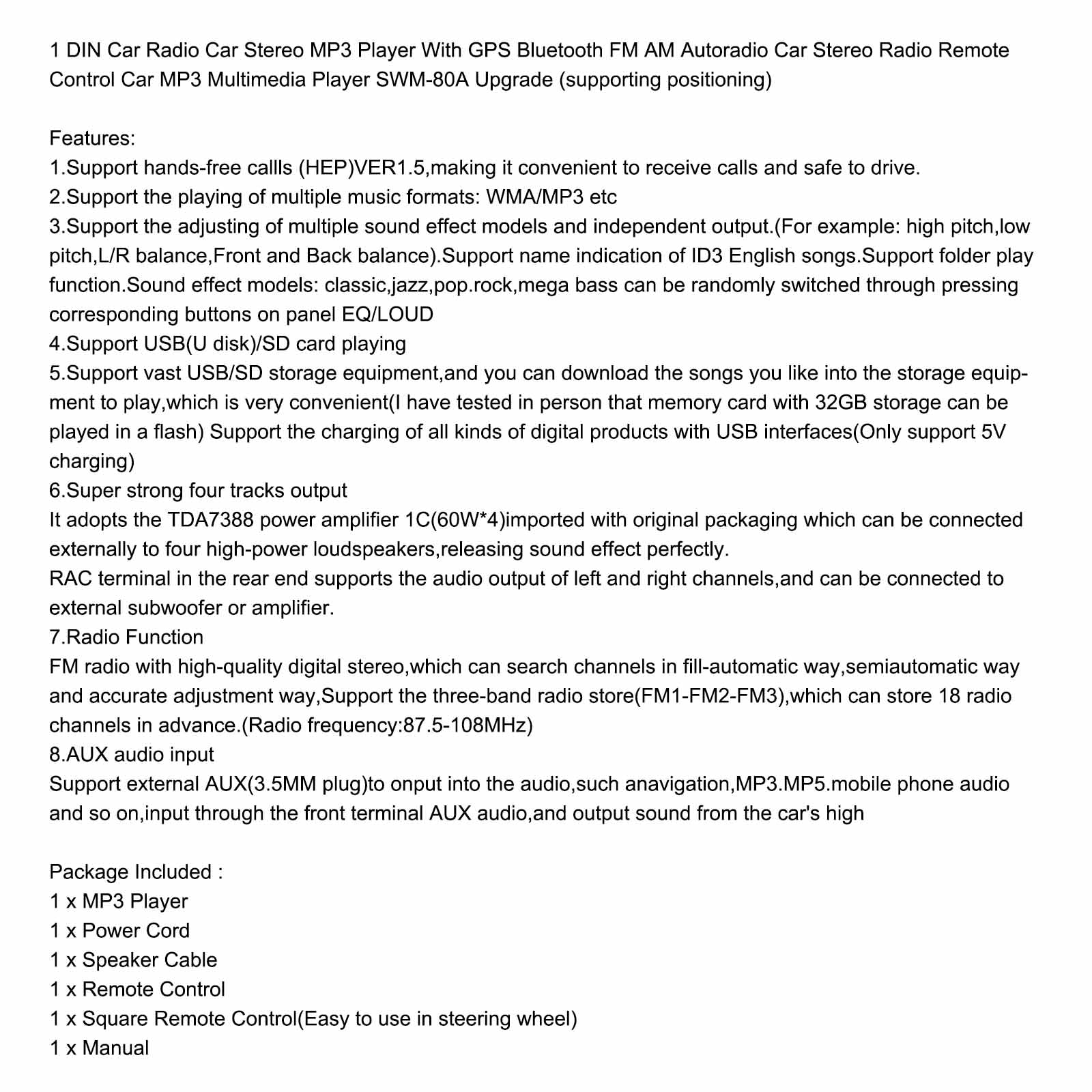 1 DIN Car Radio Car Stereo MP3 Player With GPS Bluetooth FM AM Autoradio Car Stereo Radio Remote Control Car MP3 Multimedia Player SWM-80A Upgrade (supporting positioning)