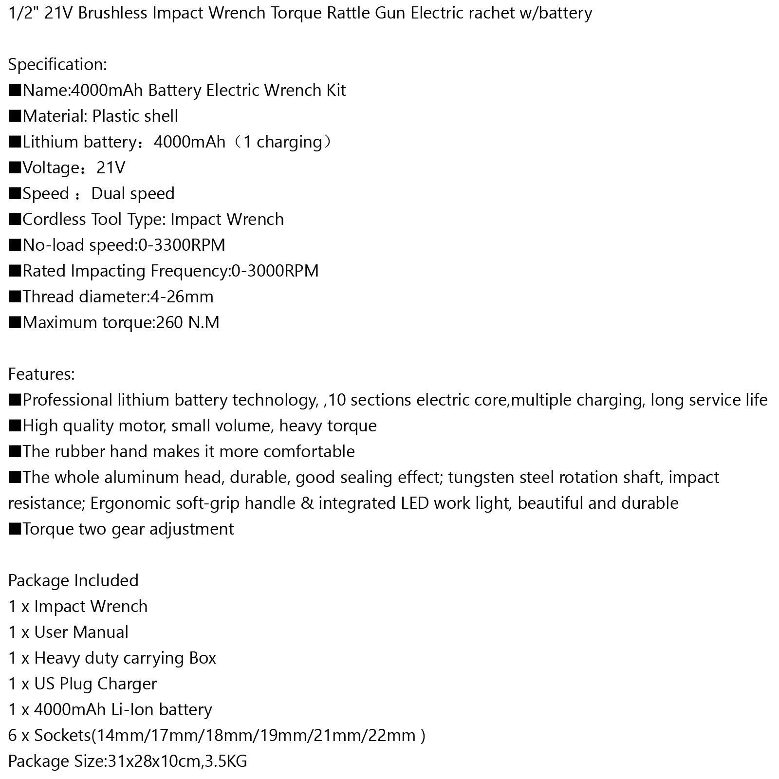 1/2" 21V Brushless Impact Wrench Torque Rattle Gun Electric rachet w/battery