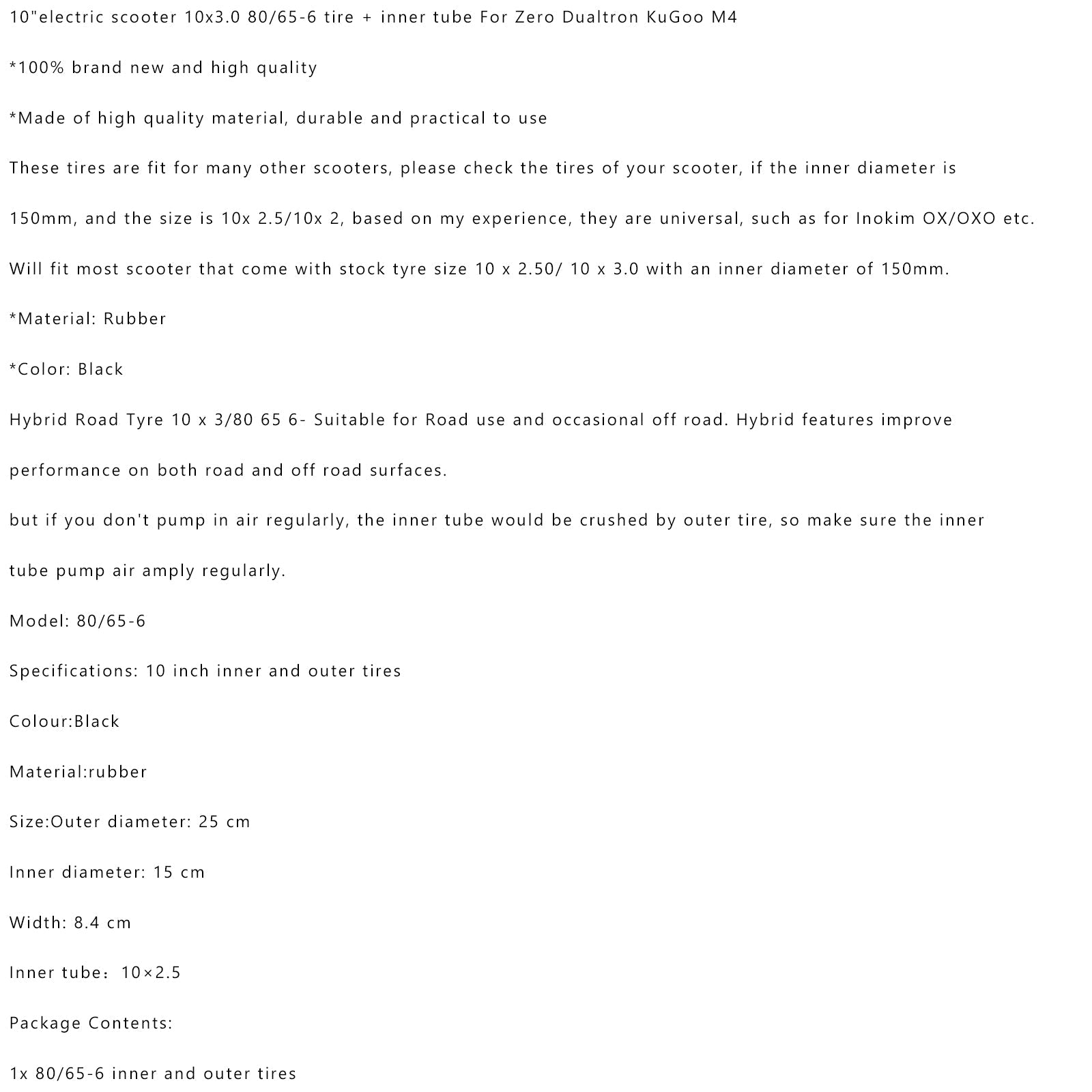 10"electric scooter 10x3.0 80/65-6 tire + inner tube For Zero Dualtron KuGoo M4