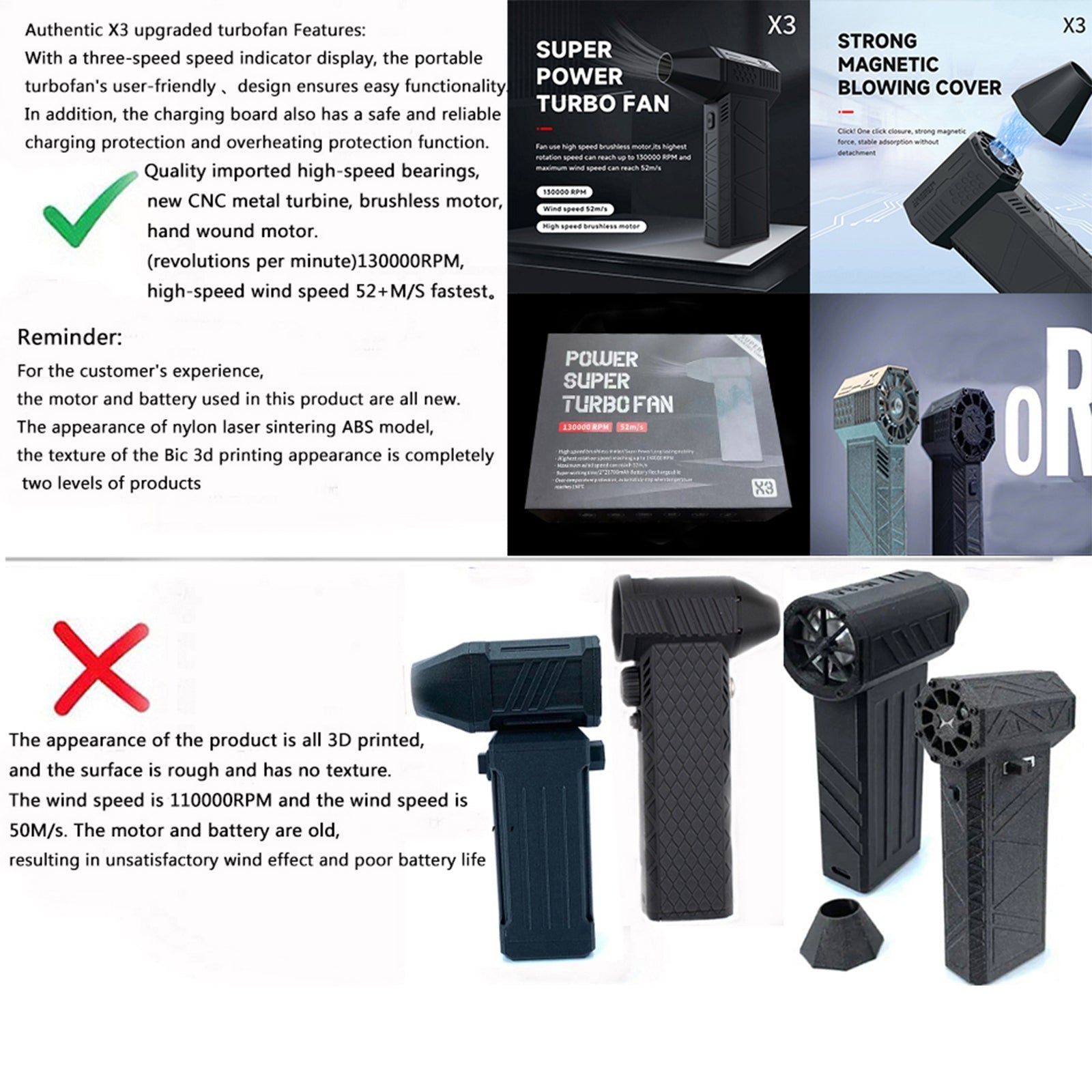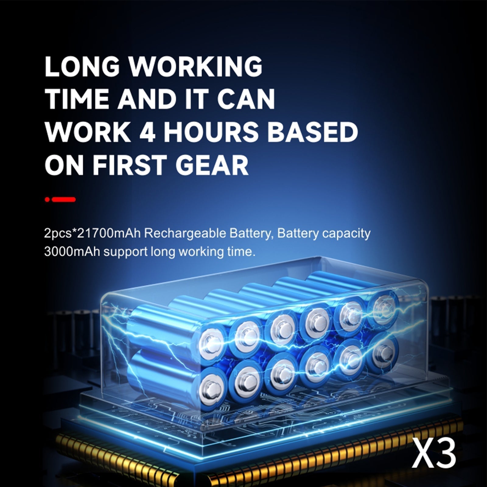 The genuine X3 upgraded version of the violent turbofan uses a brushless DC high-speed motor with a maximum output speed of 130,000 RPM. It can generate super strong wind speeds of up to 52 meters per second, which is equivalent to a 16-level typhoon. It is powerful, durable and stable, and will not burn under long loads. It also has charging protection and overheating protection functions. It has a long battery life of up to 4 hours in one gear. It has two built-in 21700 batteries with a battery capacity of 3000mAh, which makes it last longer! It can adjust the speed in three gears, giving you a different experience.