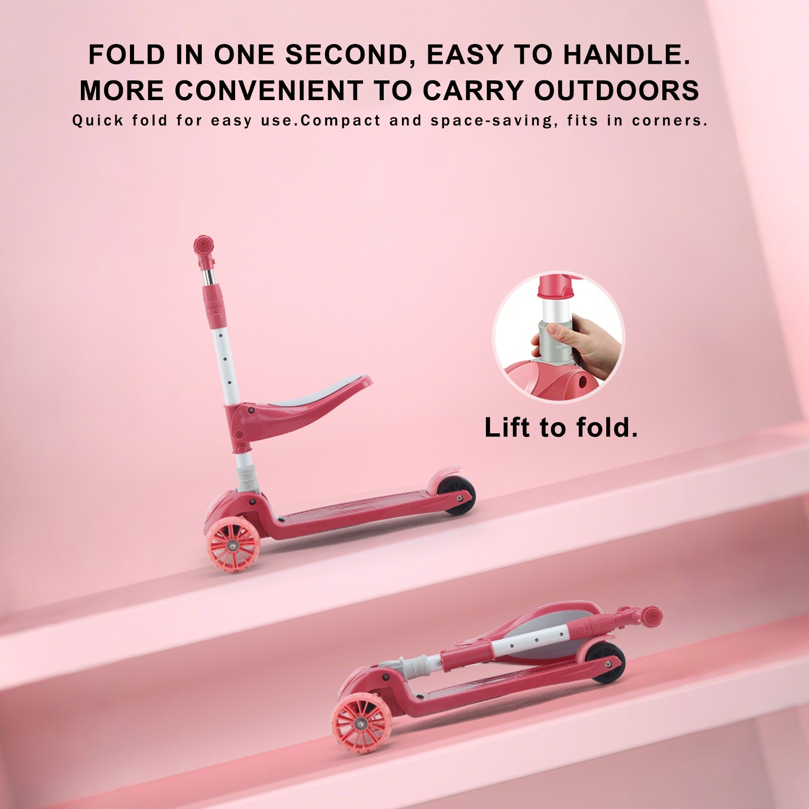 2-in-1 Pink Kids Scooter �Folding Seat, LED Light-Up Wheels, Adjustable Height