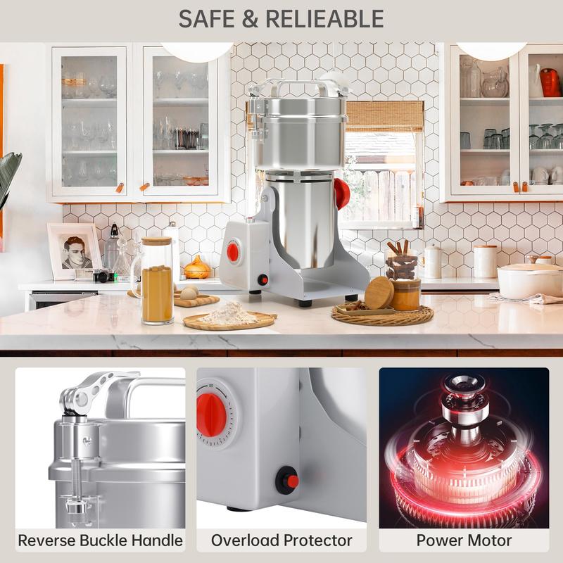 The 700g High Speed Electric Grain Mill Grinder exceeded my expectations! It's incredibly powerful and grinds everything from rice and coffee to dry herbs and spices into a super fine powder in just seconds. The stainless steel construction feels durable and easy to clean, good design, light weight , and the size is perfect for home kitchens.