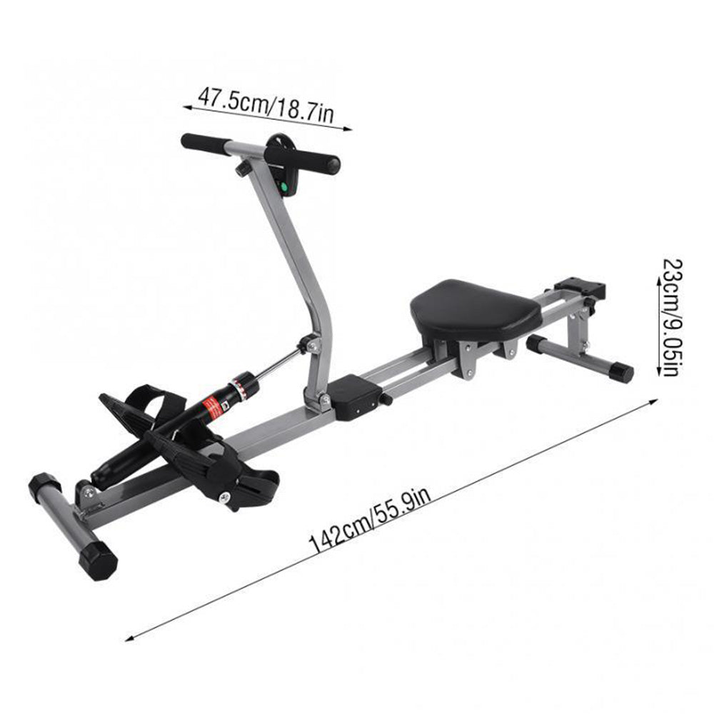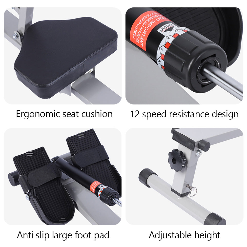 The LCD monitor displays your time, count, total count, calories, and scan., The fully cushioned handle allows for a wider range of motion, giving you a more intense upper body workout with multiple levels of adjustable tension., Textured non-slip foot pedals and foot straps will help maintain footing during the most demanding and vigorous workouts!, Extra padding and cushion ensures proper blood flow in the glutes for prolonged and vigorous workouts., Fluid inside the hydraulic piston provides smooth and challenging resistance.Different resistance levels allow for easy adjustability., Adjust the height of each foot leveler to create a balanced rowing experience, even on uneven floors.